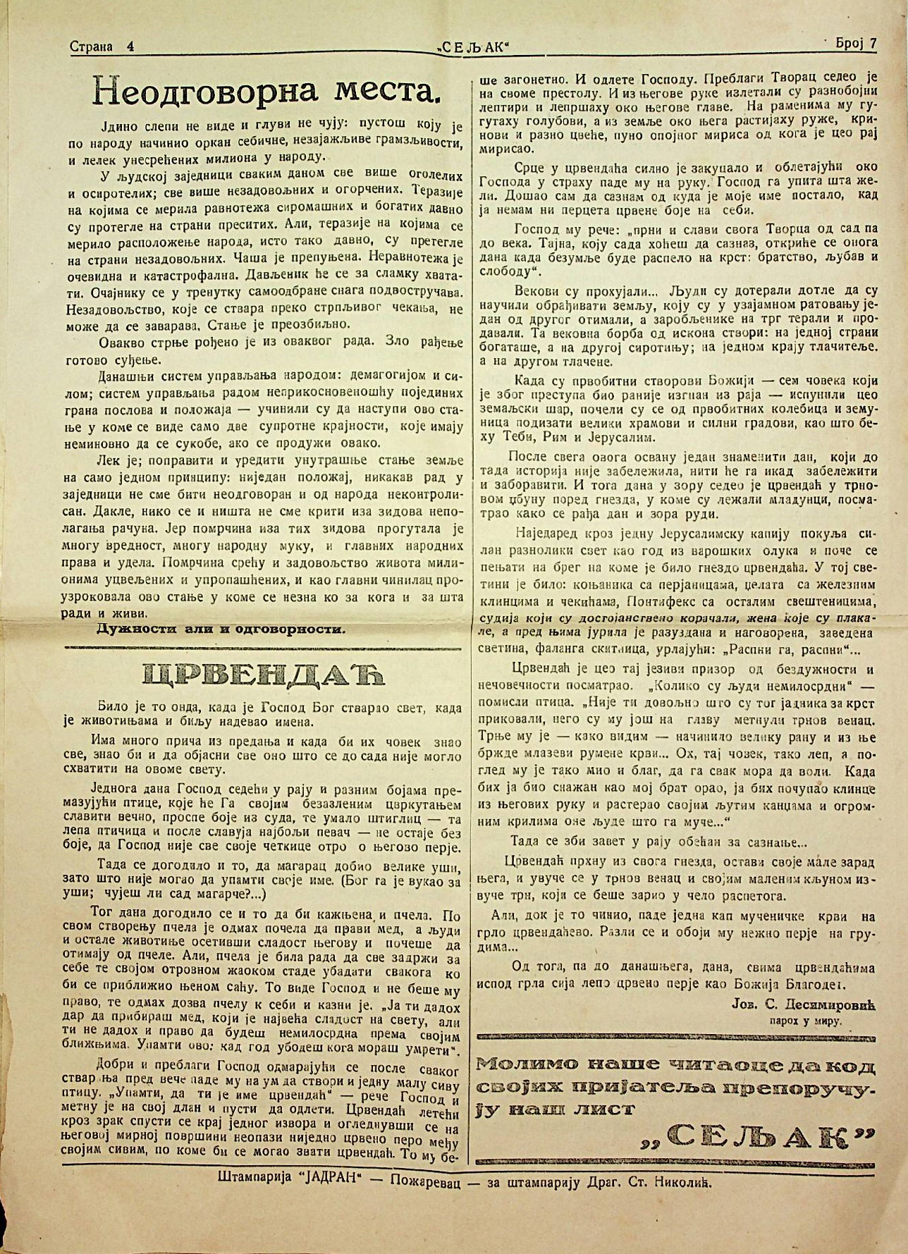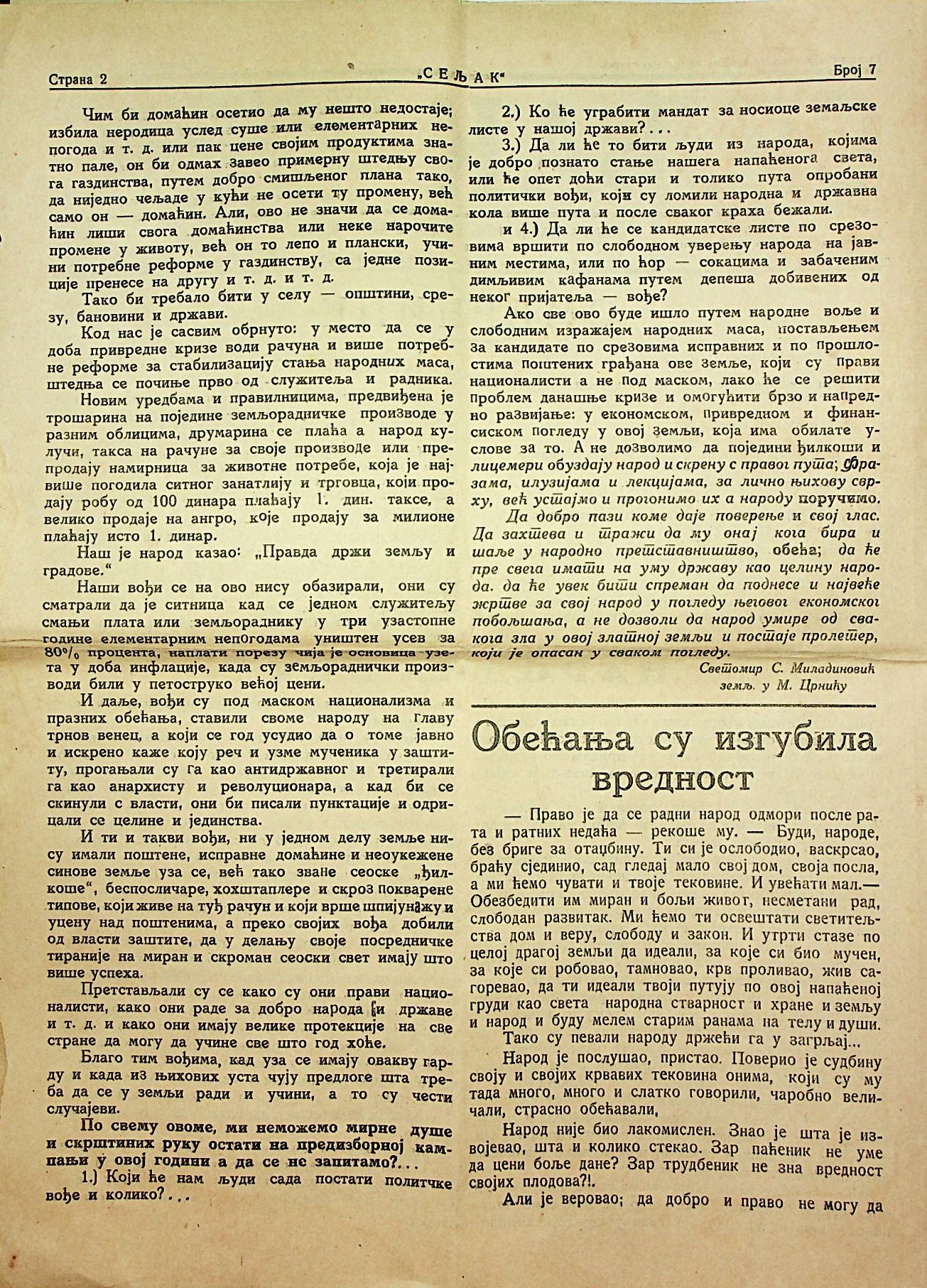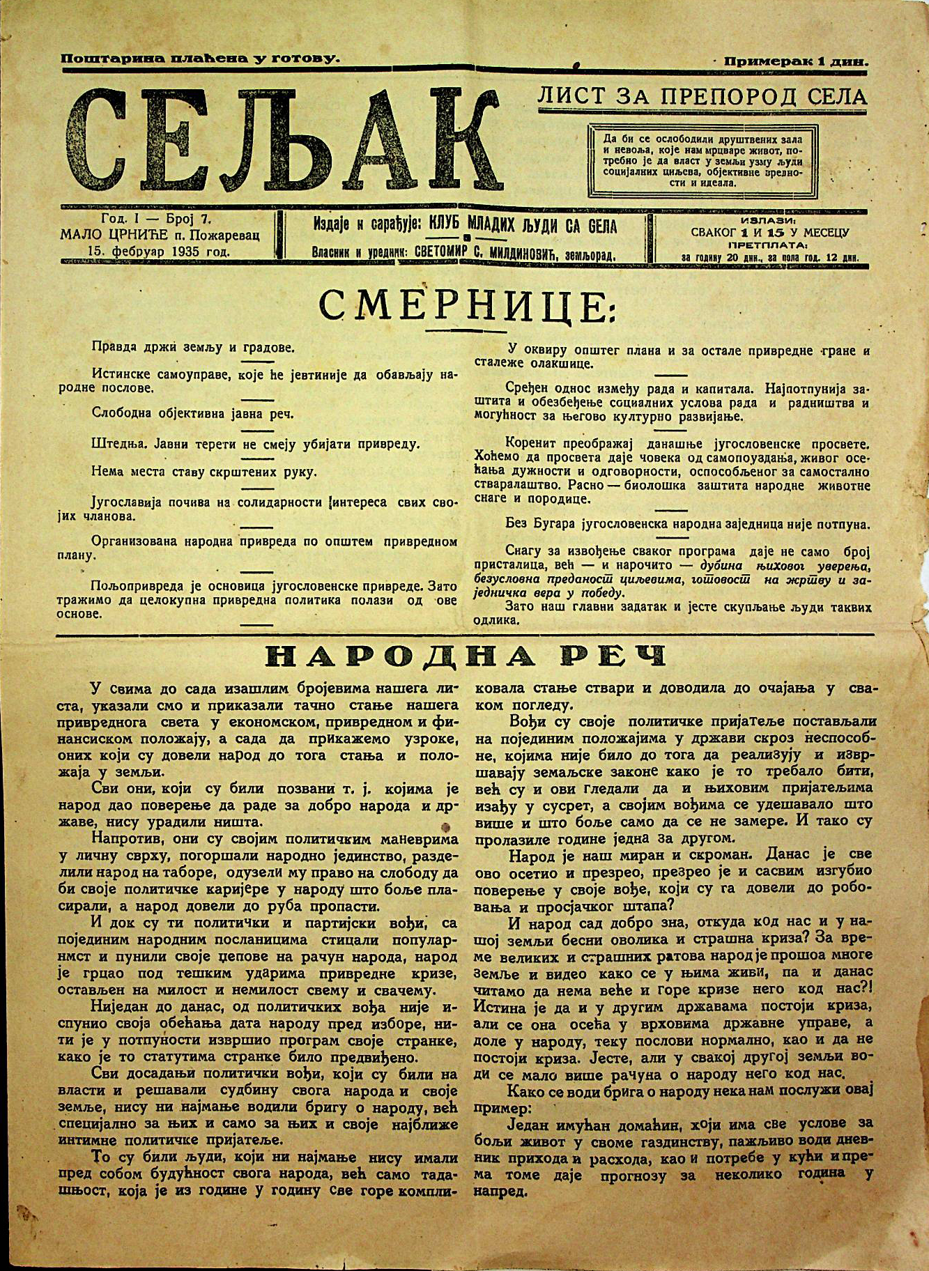 Svetozar S. Miladinović, “Seljak br. 7,” Digitalna biblioteka "Srboljub Mitić" Malo Crniće, приступљено 19. april 2026., https://digitalna.bsmmc.rs/items/show/192.